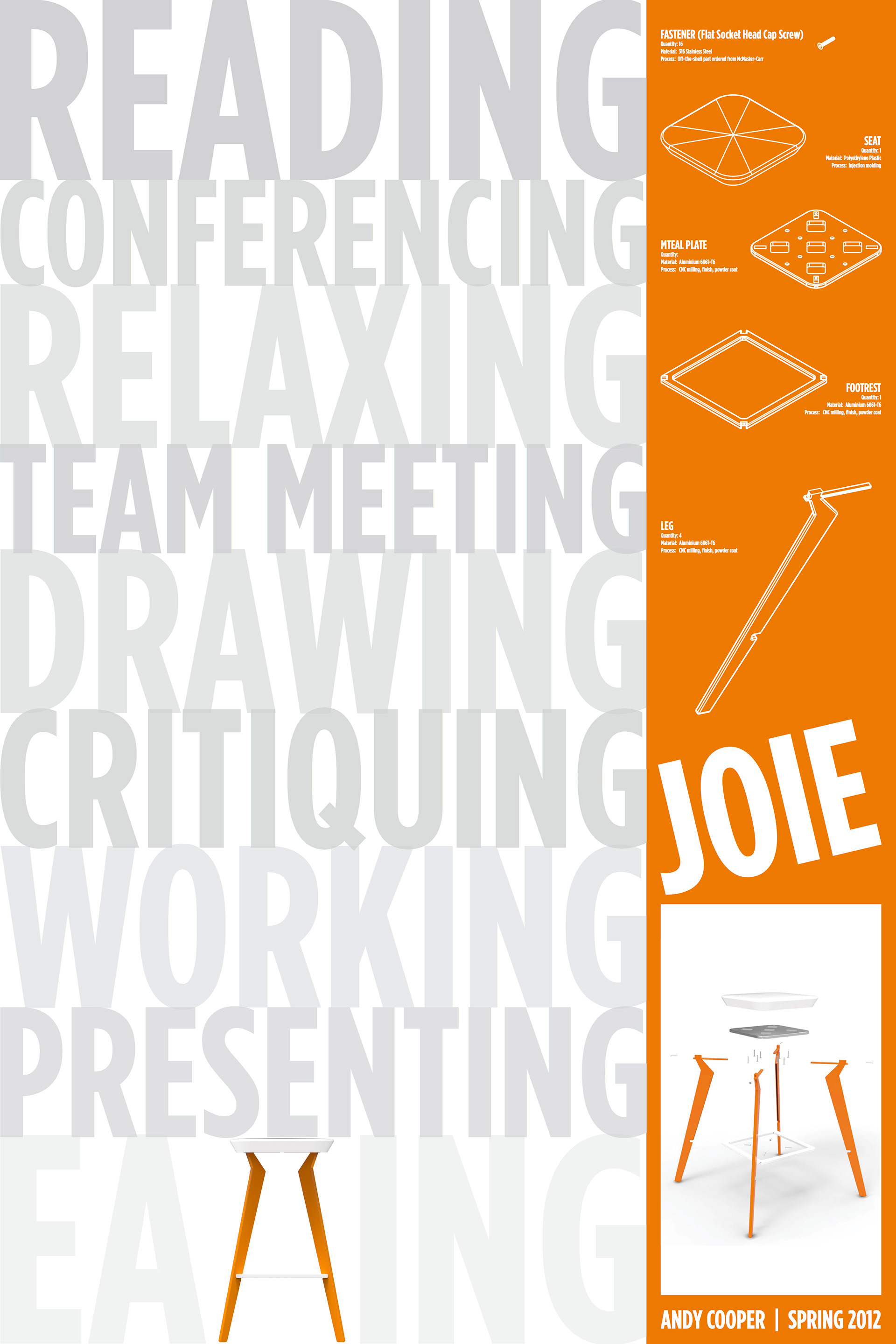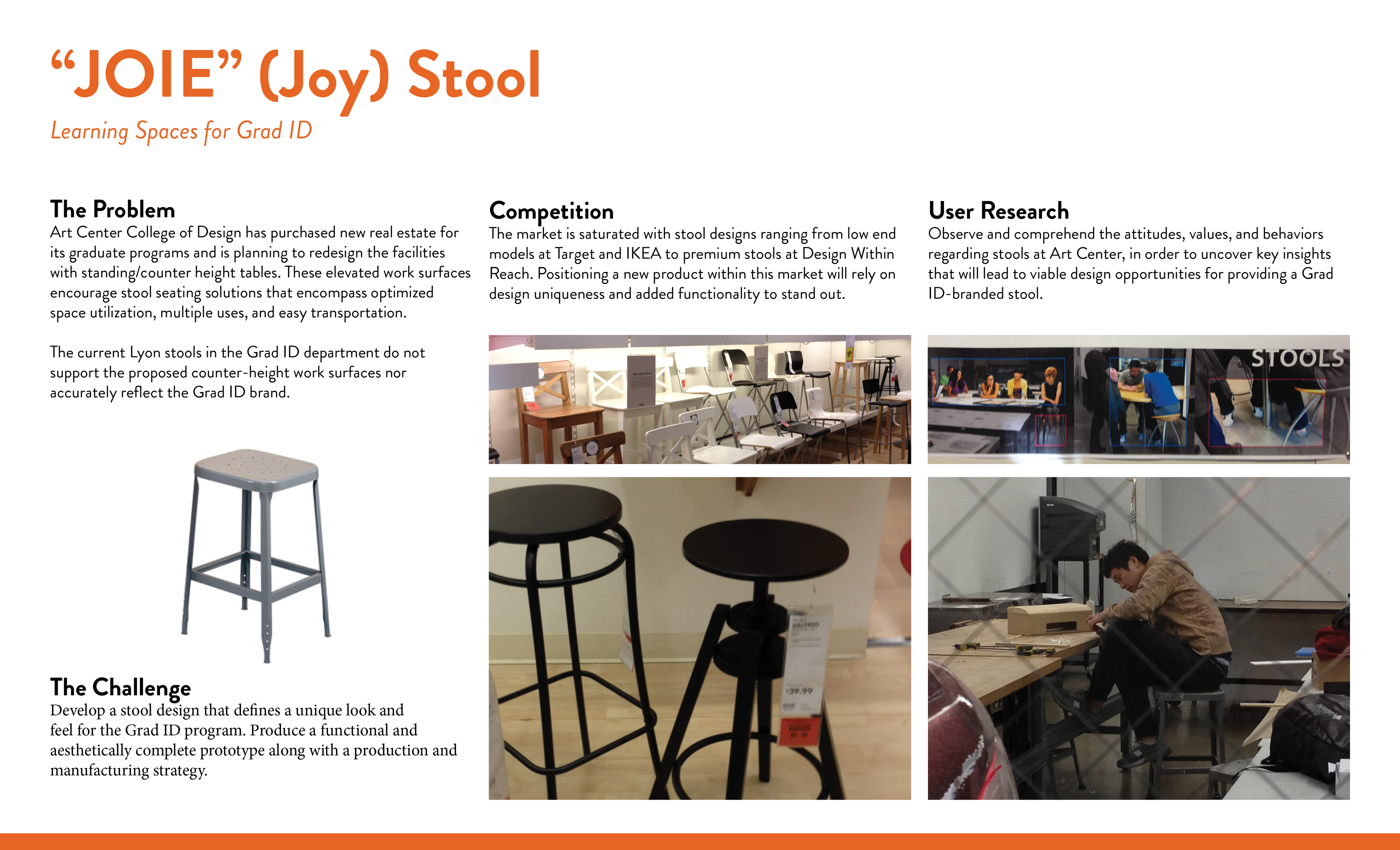 Develop a stool design that defines a unique look and feel for the Grad ID program. Produce a functional and aesthetically complete prototype along with a production and manufacturing strategy.
