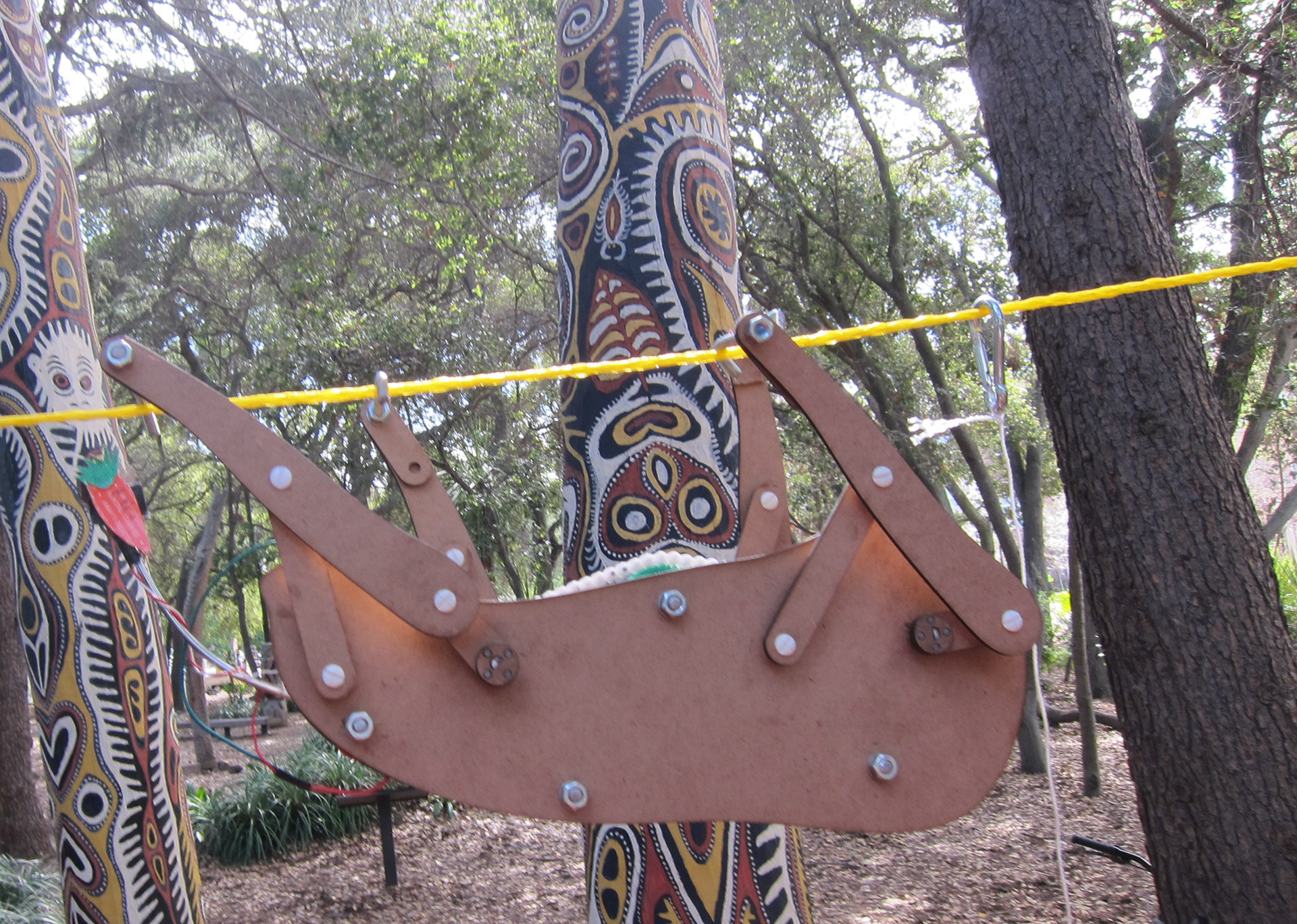 Create a half-scale mechanical sloth prototype that hangs upside down and traverses cables strung high above ground while mimicking a sloth’s gait. Include a switch that automatically paralyzes the sloth upon arrival at the stop block anchored near the end of the cable. The model needs to be between 20 and 40 cm long and move at a pace of 3-8 cm/s using self-contained battery power.